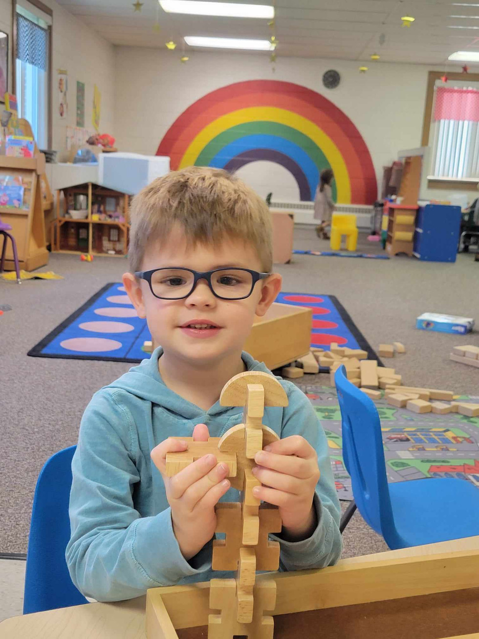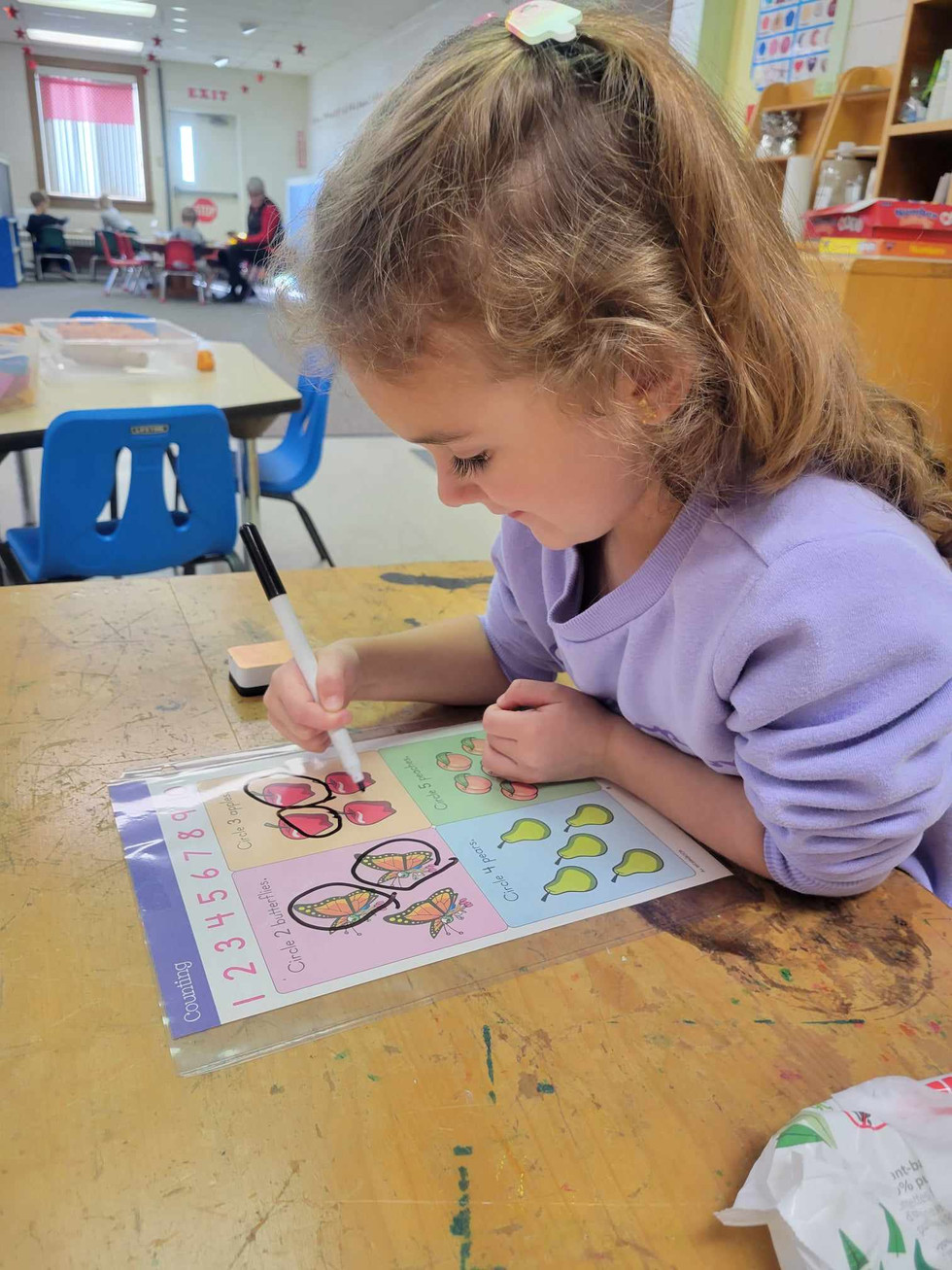 Our program consists of four classes designed to fit the needs of every student and their family. Through many learning activities, crafts, songs, books, and much more, children are engaged to learn their letters, numbers, colors, shapes, patterns, opposites, rhyming, sequencing, size, etc., along with writing skills. With a soft Christian environment, children are guided through their days to share and care, while using their imaginations and energy to fill our spacious classroom with joy.
